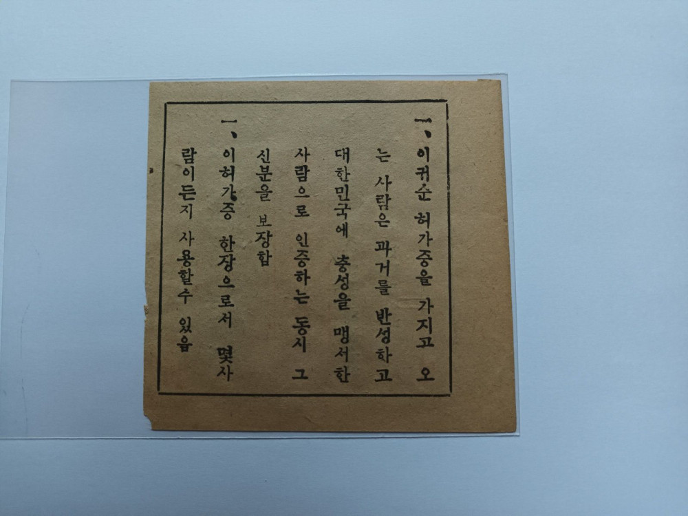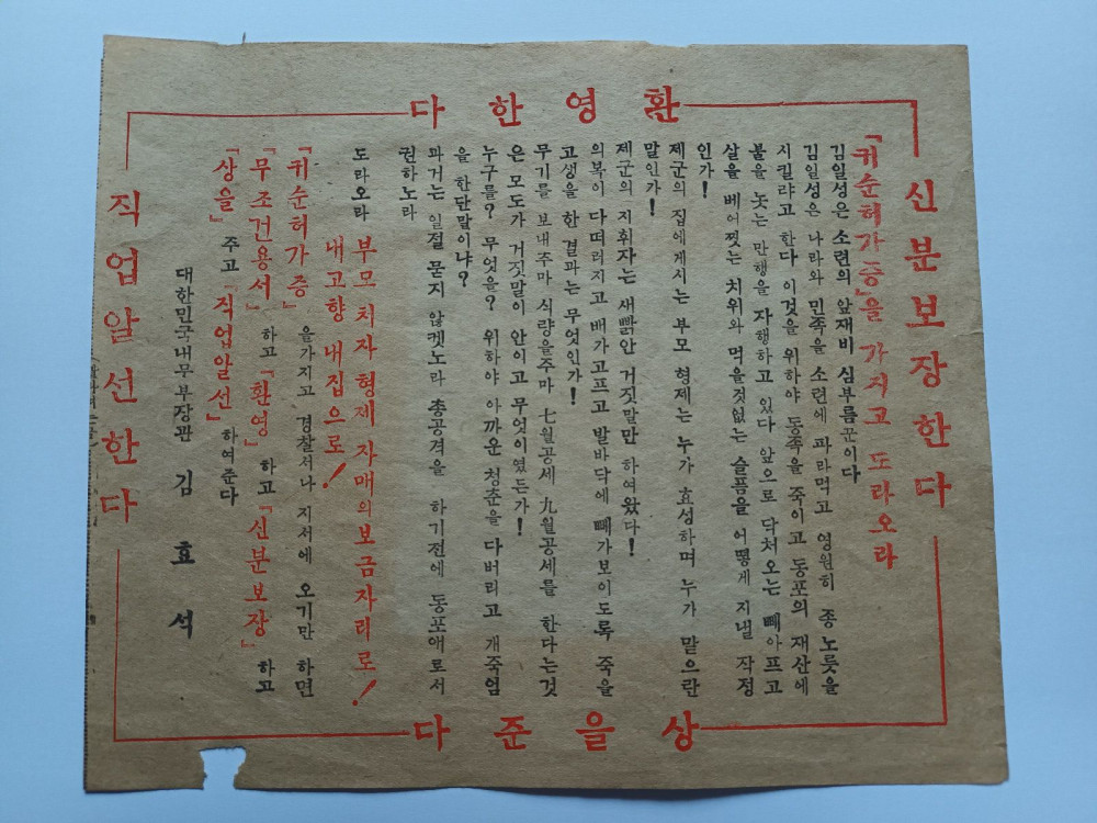 대(対) 빨치산(공산 게릴라) 삐라, 귀순허가증 1매.